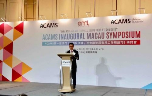 เขากำลังบอกในภาษาจีนกวางตุ้ง–มีการแปลพร้อม–ในตอนเริ่มของ ACAMS ครั้งแรกมาเก๊าการสัมมนา, เหตุสำหรับผู้ที่มีความชำนาญในด้านการควบคุมดูแลหรือให้ความสนใจในประเด็น. อักษรย่อ “ACAMS” หมายคือชมรมของผู้ที่มีความเชี่ยวชาญด้านการคุ้มครองป้องกันการฟอกเงินที่ได้รับการยืนยัน